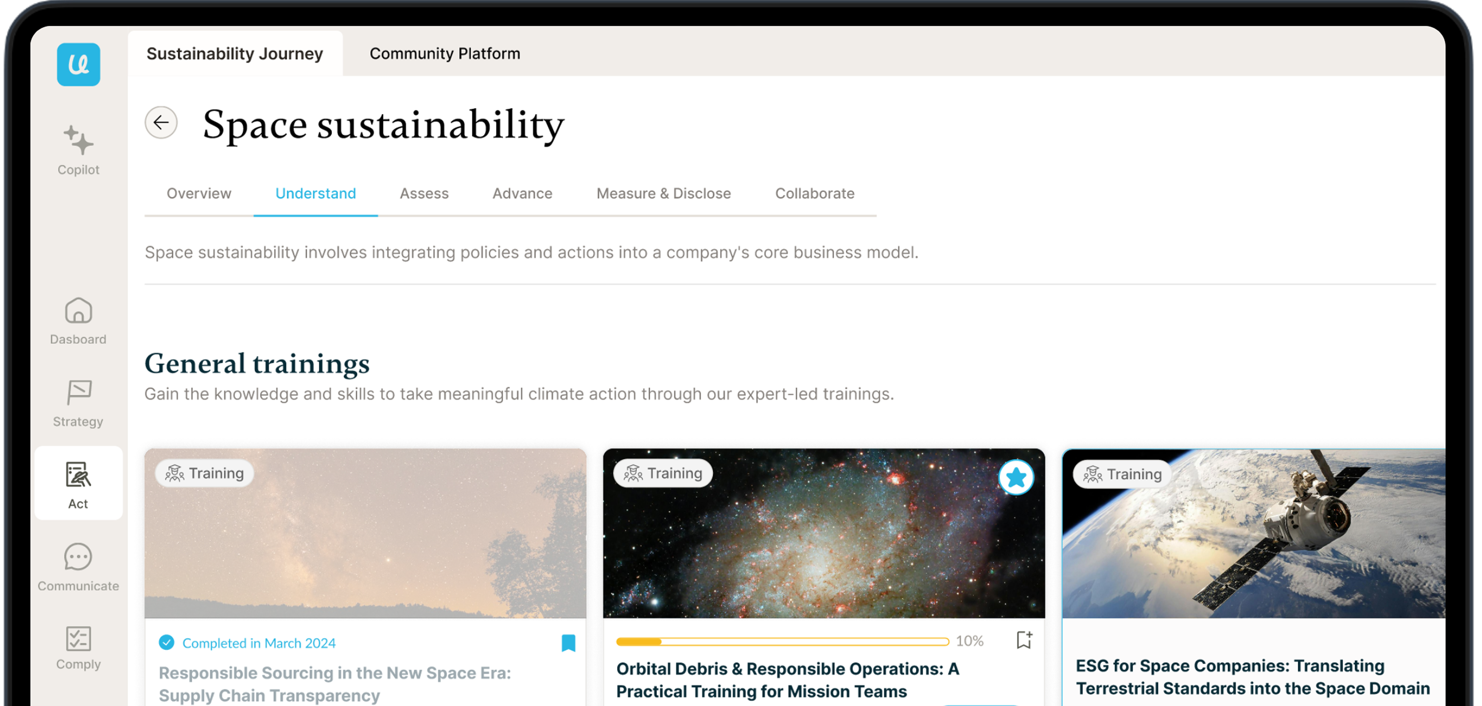 Lo spazio orbitale è una risorsa finita che richiede una gestione responsabile. Supportiamo le aziende nel comprendere le emergenti aspettative normative (es. EU Space Act) e di mercato legate alla sostenibilità orbitale e a integrarle nelle decisioni strategiche e nei sistemi di governance aziendale, garantendo l'accessibilità allo spazio per le generazioni presenti e future.